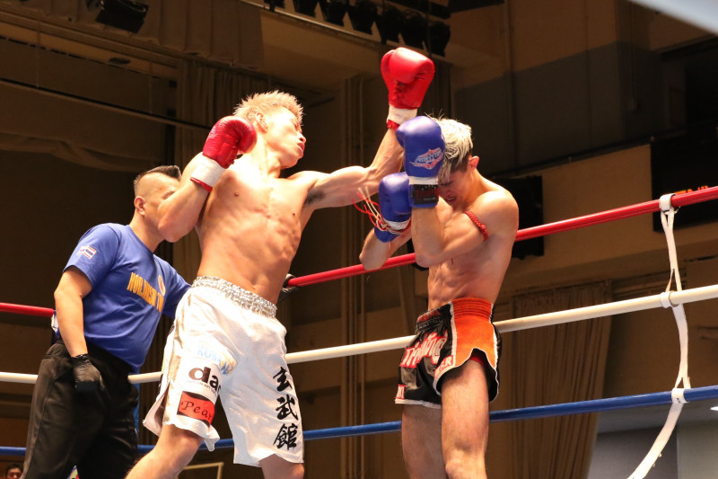 初のヒジ有りルールも直樹(左)が多彩な攻撃で判定勝利
