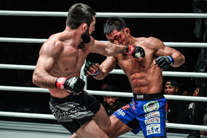 ユサップ(左)のパンチを被弾し流血する竹中