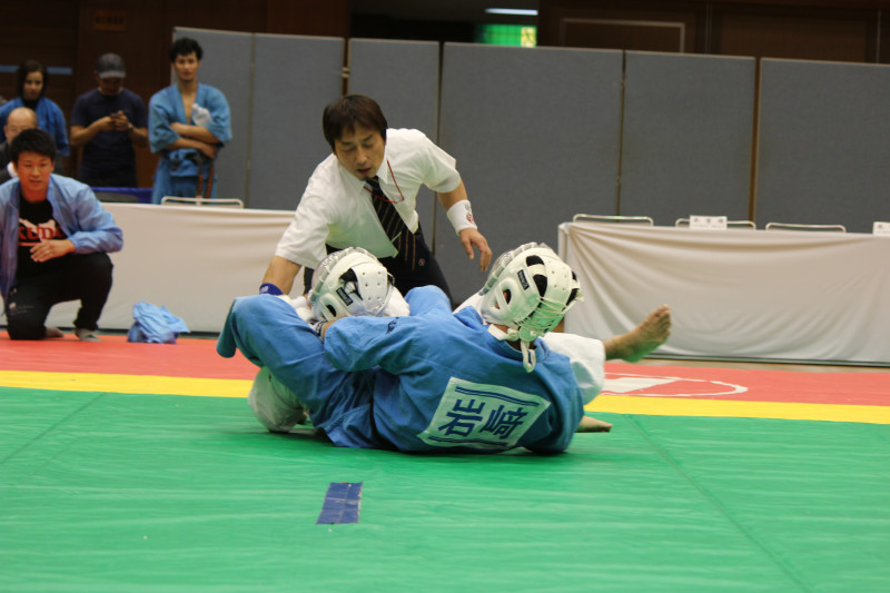 引き込んだ服部(白)に対し、岩崎(青)のボーアンドアローチョーク