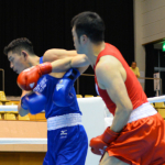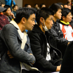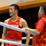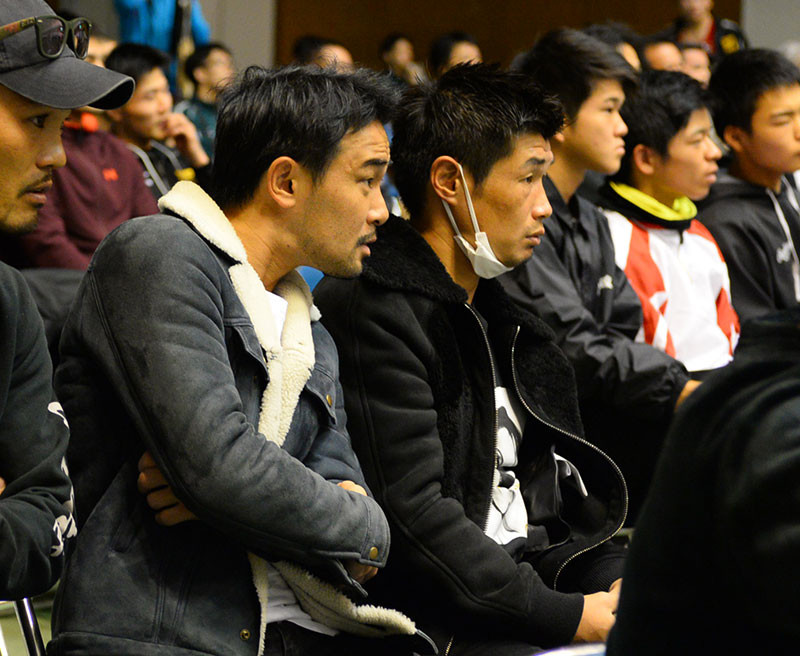 佐藤の激闘に固唾をのんで見守る山中(左)と長谷川(右)