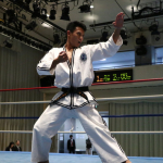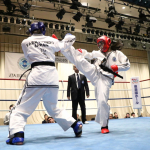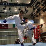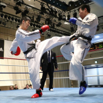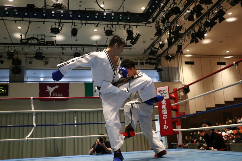 準々決勝を激闘で勝ち上がった西岡健(右)にも体格差を活かした豪快な蹴りで圧倒した倉田