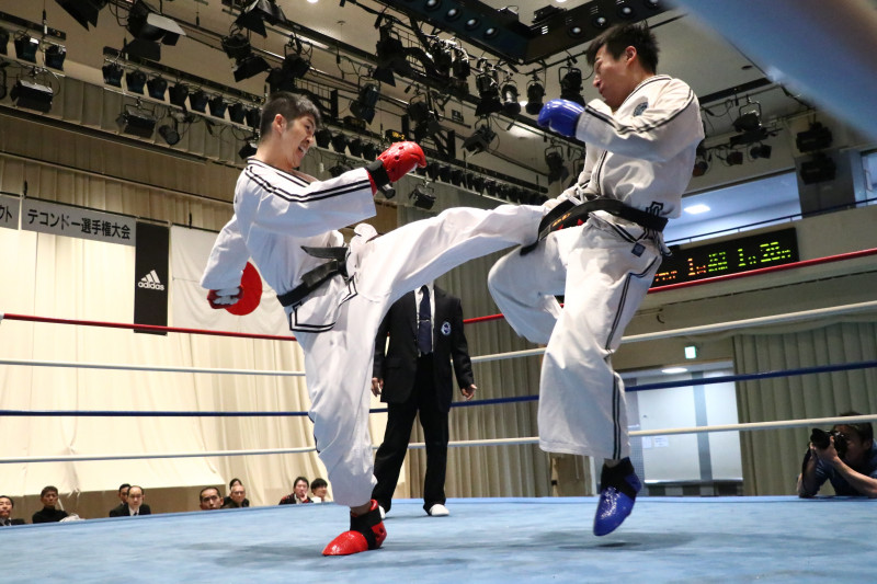 パワフルな蹴りで八幡の攻撃を制した倉田(左)