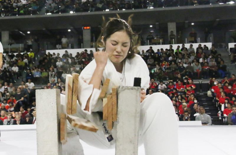 組手では決着つかず、最後は試割り決着に。永吉は初のヒジでの板割りに挑戦し四枚成功