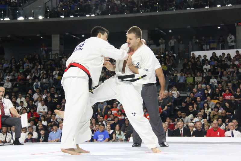 イエロメンコは上田の太ももが効いたと見るや右のローキックを連打する