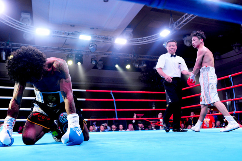 ボディブローで容赦なくインドネシア選手をキャンバスに沈めまくった田村(右)