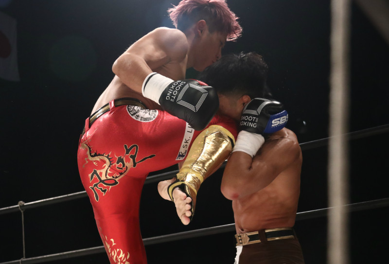 顔面へのヒザ蹴りでKO勝ちした竹野(右)