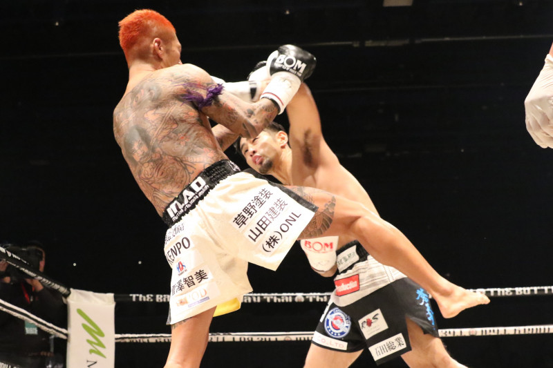 KAZU(奥)がタイミングのいい左ストレートをヒット、誠の傷を開きWMC王座獲得