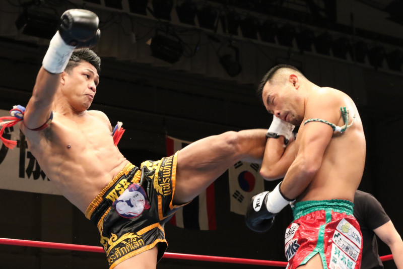ガムライペットは緑川の前進をタイミングのいい左の蹴りで寸断、緑川は攻め込み切れない