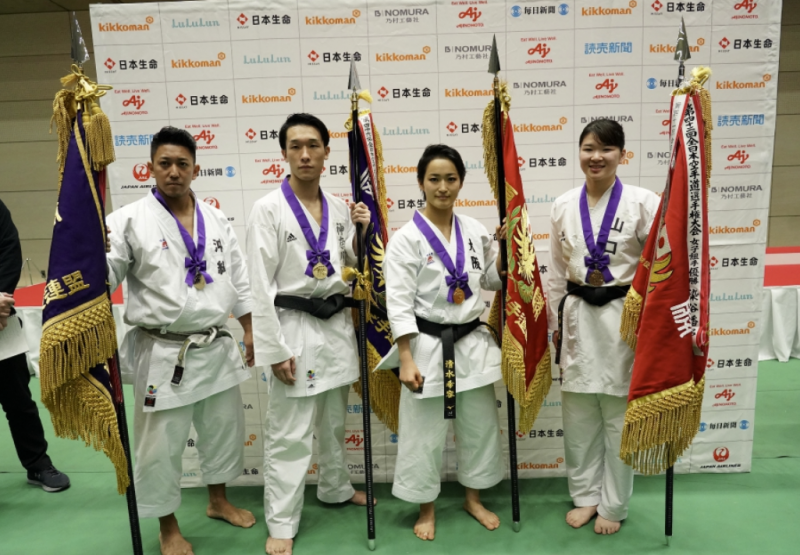 左から各優勝者。喜友名諒(形)、五明宏人(組手)、清水希容(形)、齊藤綾夏(組手)