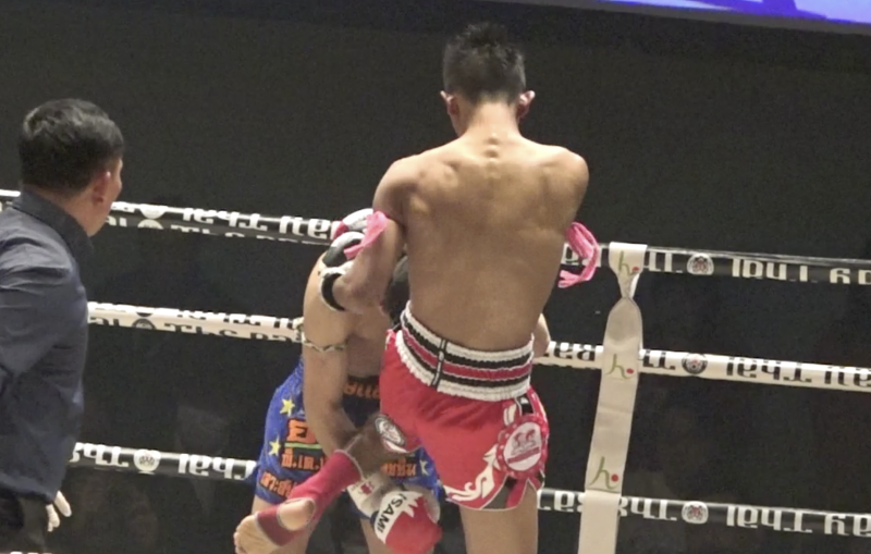 このヒザ蹴りが突き刺ささり、ペットチャワリットがダウンを奪った