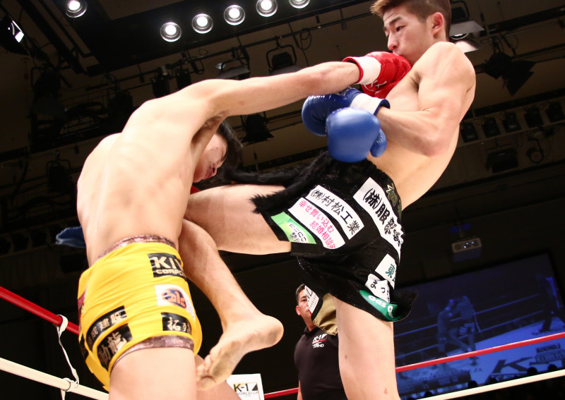 稲垣(右)に左ストレートをヒットさせた瓦田(左)