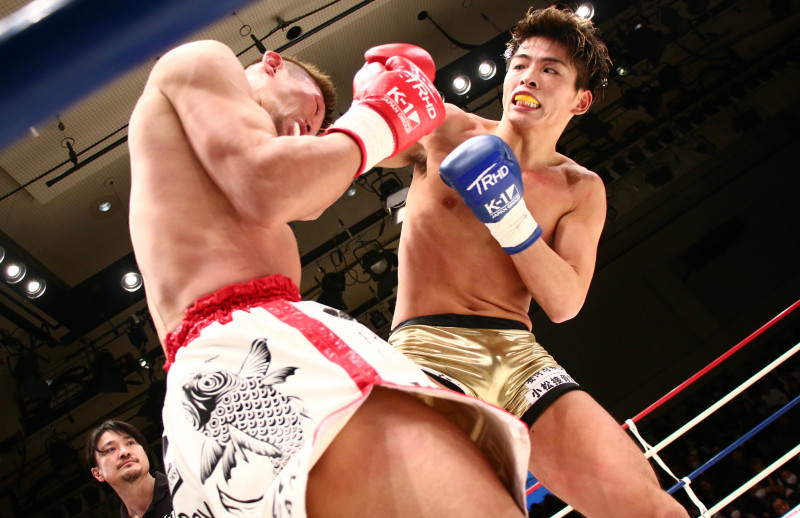 パンチ連打で牧平(左)から逆転KO勝ちした加藤(右)