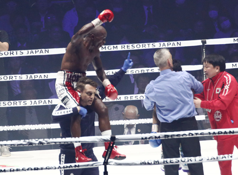 勝利し拳を上げるムザラネ(左)と、その横でレフェリーに抱きかかえられる八重樫
