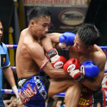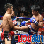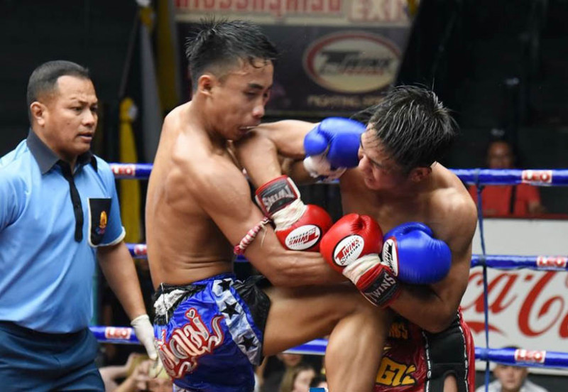 福田(右)のヒジと相手のヒザ蹴りが交錯する。大接戦だった。