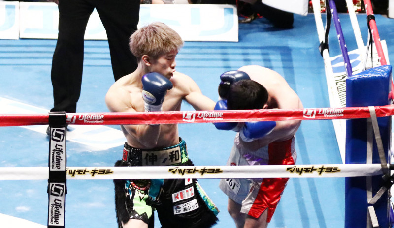 コーナーに詰め左アッパーで攻める田中
