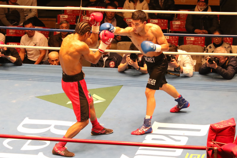 長距離から放つトゴルドルのストレートでデスティノは踏み込み切れない