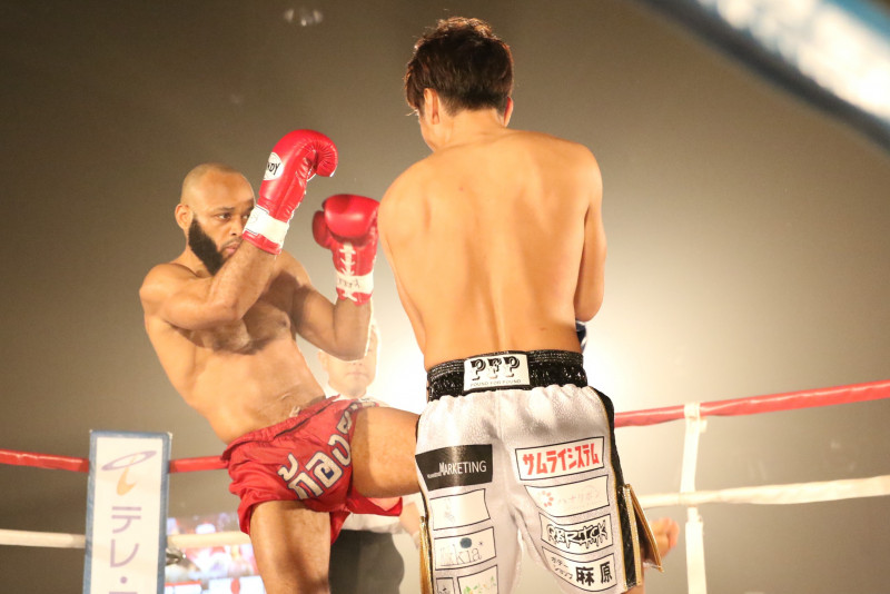 ドウリャはスイッチを見せながらローキックを効かせ、麻原はボディブロー、ミドルキックで腹を攻める