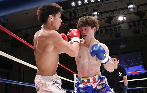打ち合いに挑む金子(右)逆襲及ばずKO負け