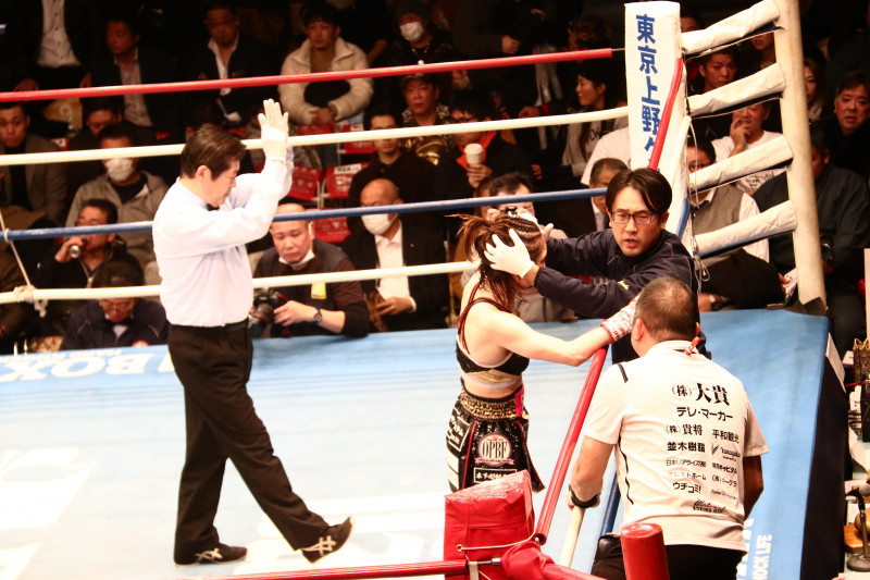 谷山の出血によりレフェリーが試合を止めた