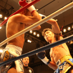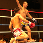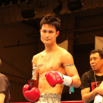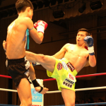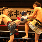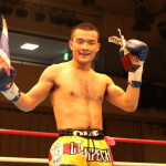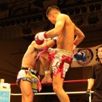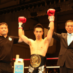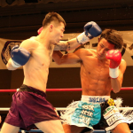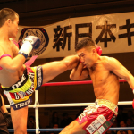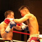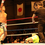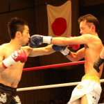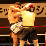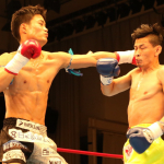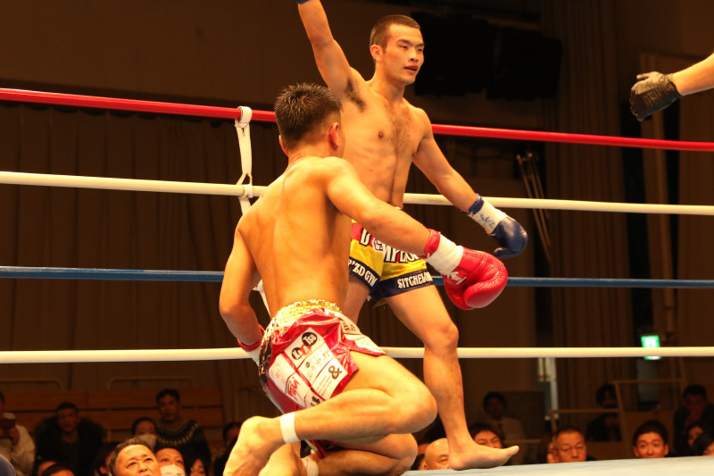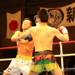 ロンペットの左フックが直撃、勝次はヨロヨロとヒザをつきダウンを喫してしまった
