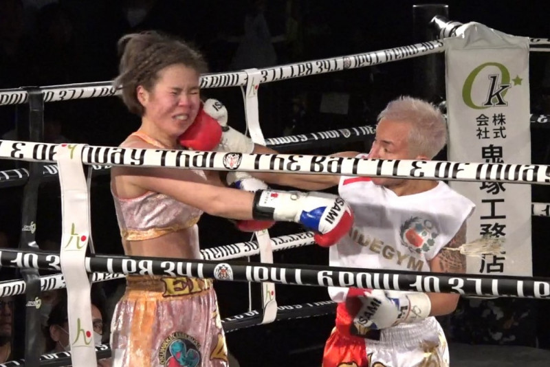 徐々に回転が上がるMIREYのパンチが奥脇の顔面をとらえていく