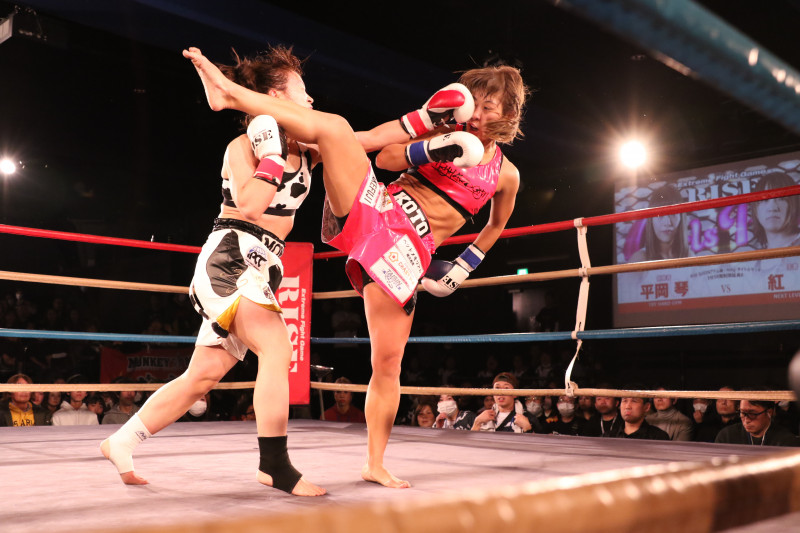 平岡の大技・後ろ回し蹴りで紅絹がダウン