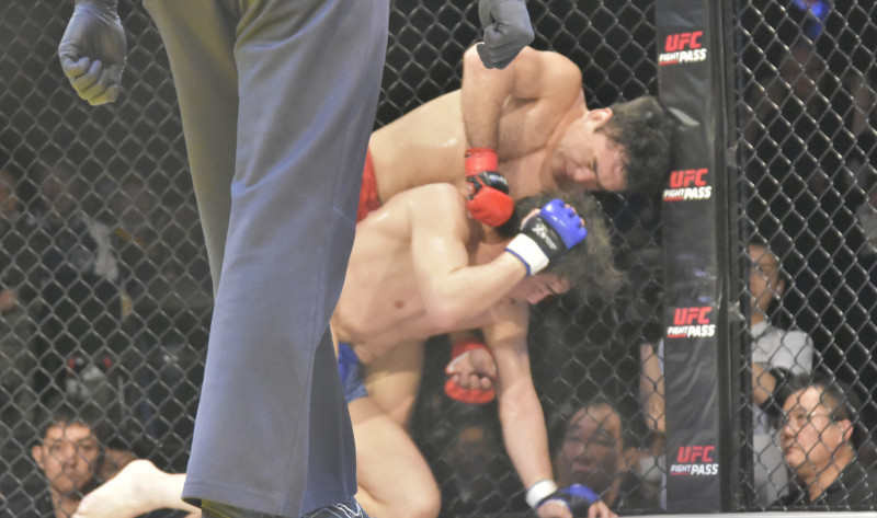 バックを取りパウンドを連打する村山