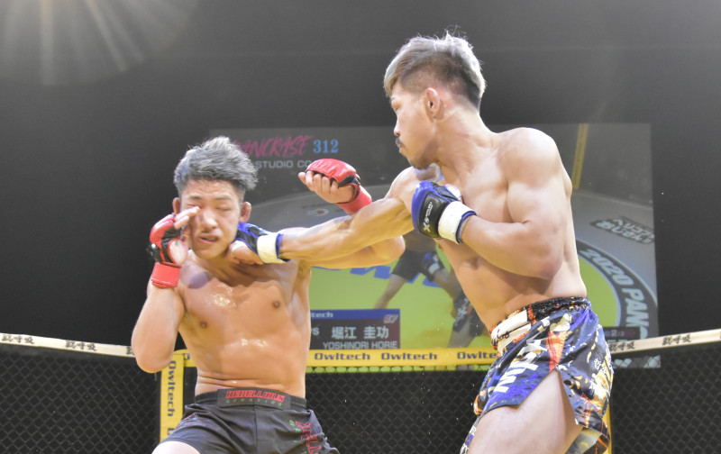 壮絶な打撃戦、内村のパンチが堀江の顎にクリーンヒット