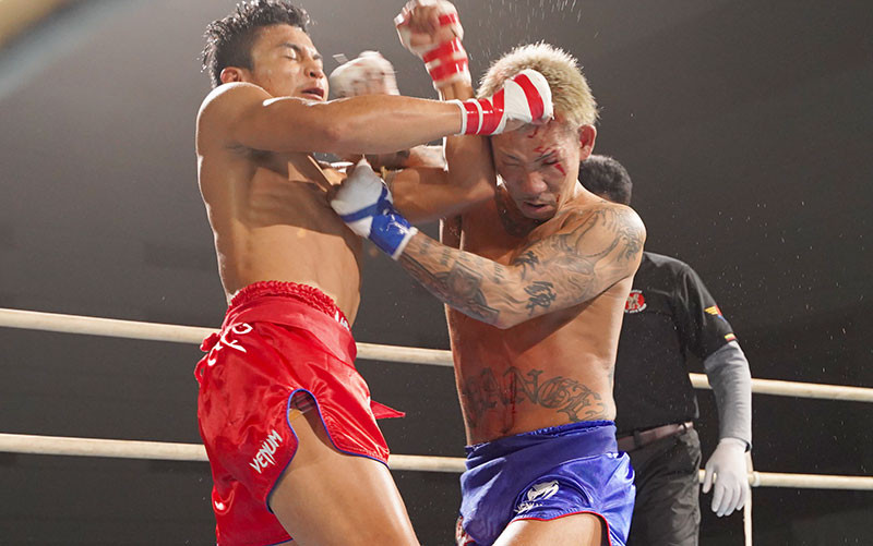 パンチを応酬する真虎斗(右)とソウ・シュエ(左)