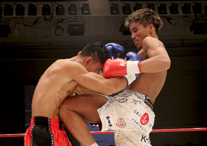 スリヤンレックのボディに軍司の膝蹴りが突き刺さる