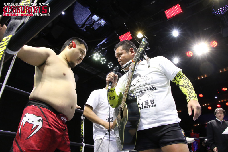 ギターとマイクを手に、歌いながら入場したアンディ(右)