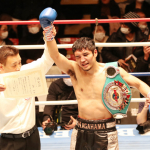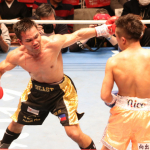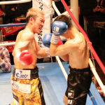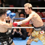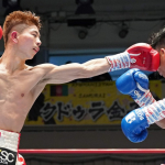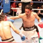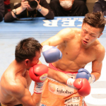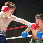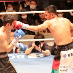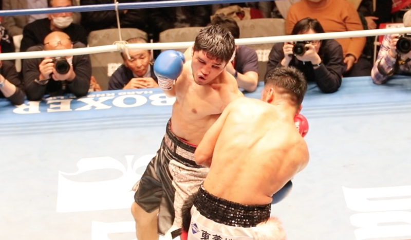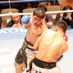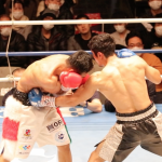 長濱の左ボディブローがクドゥラのボディをえぐる