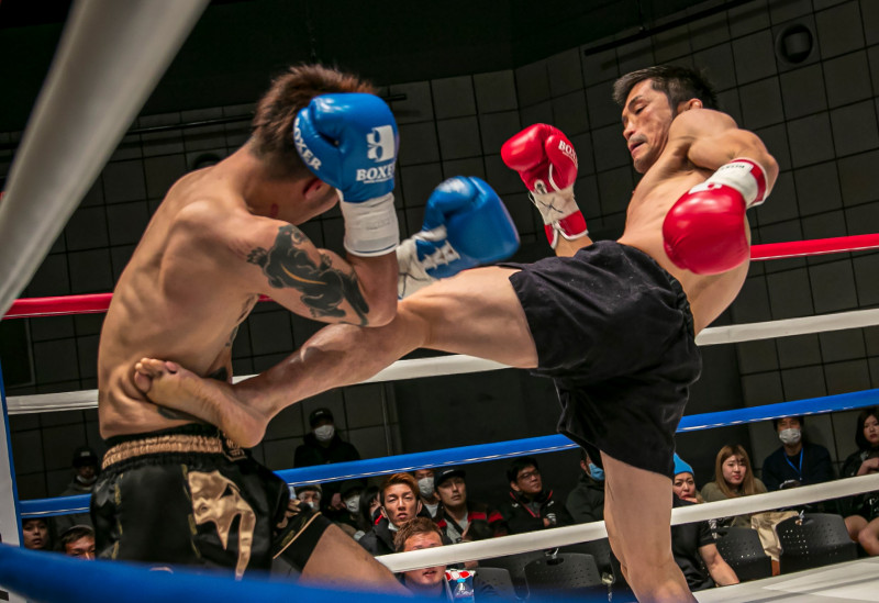 ミドルキックを叩き込み、見事KO勝利した藤原