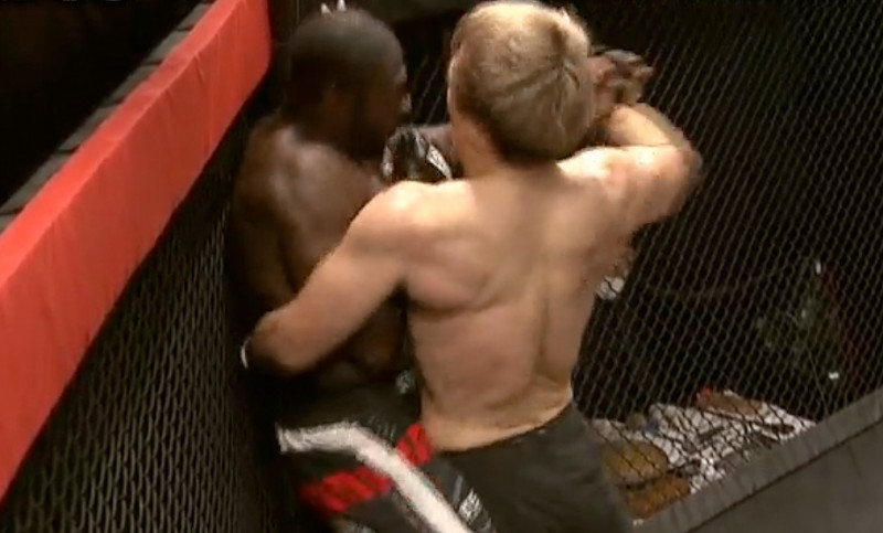サープリスを金網に押し込みパンチで攻める岩﨑