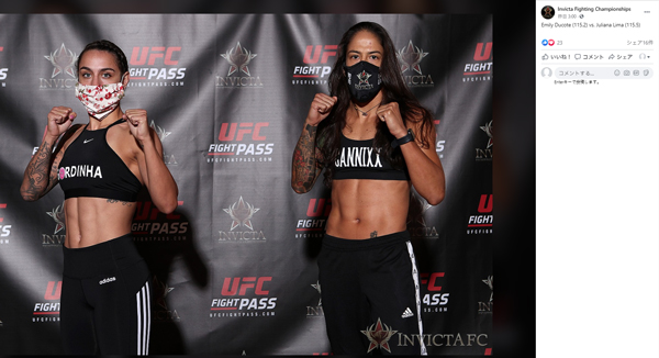 ドゥコッティ(左)とリマ(右)が前日計量で並んでファイティングポーズ(Invicta Facebookページより)