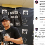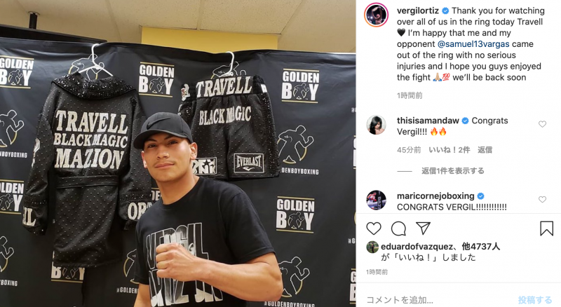 試合後、控室で無傷な表情でファイティングポーズをとるオルティス(オルティスのインスタグラムより)