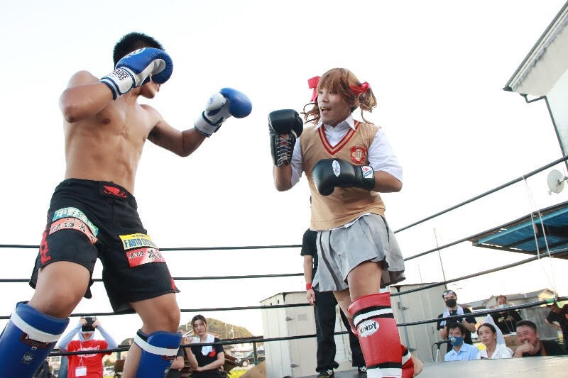 長島(右)はセーラー服で楽しくスパー