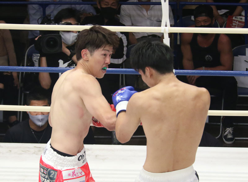 右フックをヒットさせる山際(左)