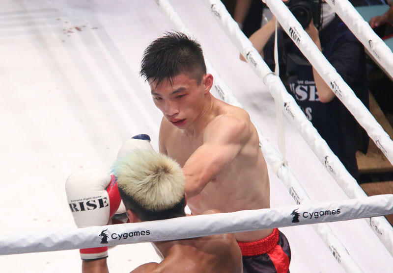 強烈なパンチを打ち込んでいく大崎、新王者となった