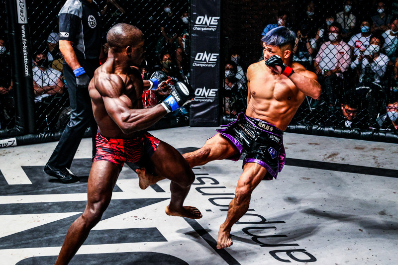 強烈な右ローを打ちつける大尊(C)SUSUMU NAGAO