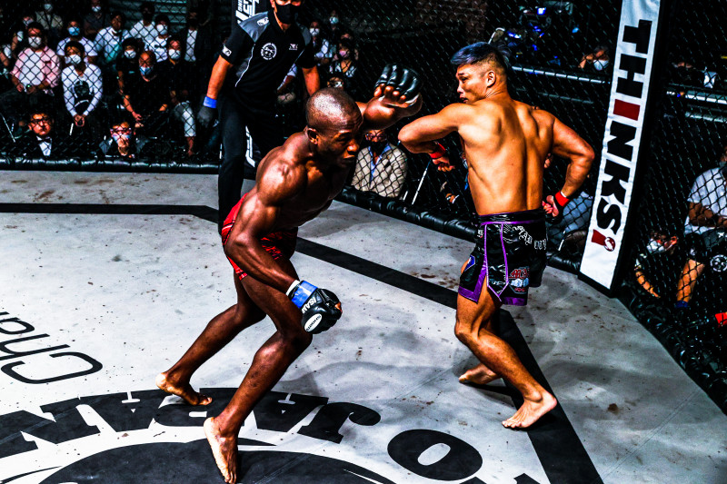 大尊の左フックがクリーンヒット、マックスがダウンする瞬間(C)SUSUMU NAGAO