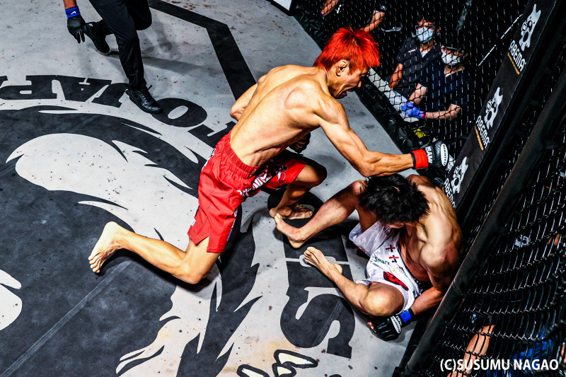 マットに崩れる飯野を猿丸のパンチが襲う