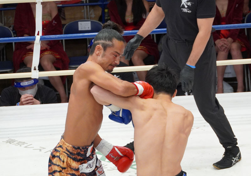打ち下ろしのパンチをヒットさせる島野、圧巻のKO劇であった