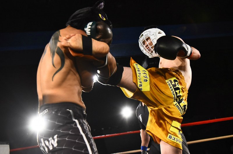 原島(右)が引退エキシで浦林(左)に左ミドルを見舞う