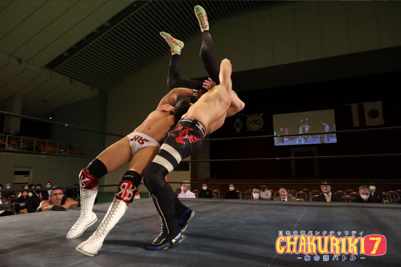ダブルのブレーンバスターをかけられる青木(上)