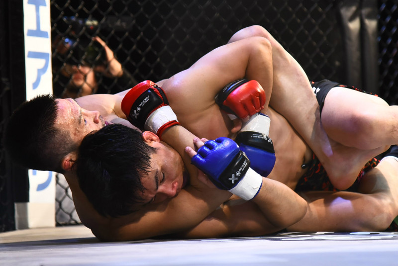 TSUNE(右)をスリーパーで追い込む春日井(左)