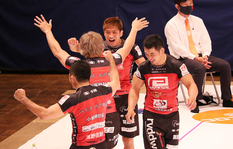 優勝に歓喜する所(中央)とチームメンバーたち