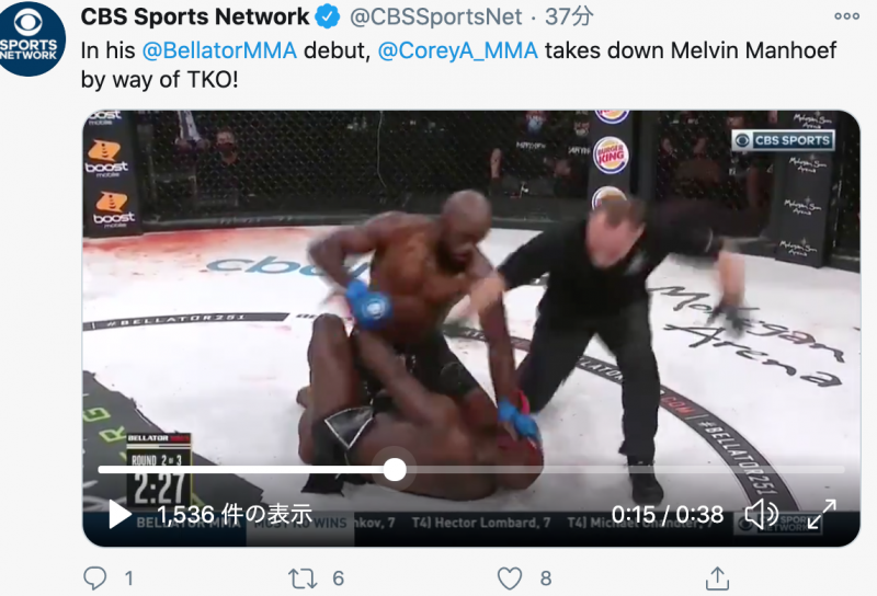 ヒジの連打でマヌーフからTKO勝利したアンダーソン(CBC Sports Networkより)