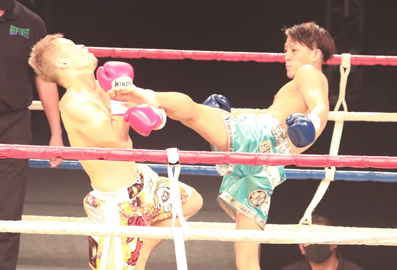 竹内(右)が鋭い蹴りで桝本を追い詰める