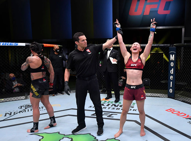シャオナン(右)がガデーリャに勝利し、両手を上げて喜ぶ(getty/Zuffa LLC/UFC)